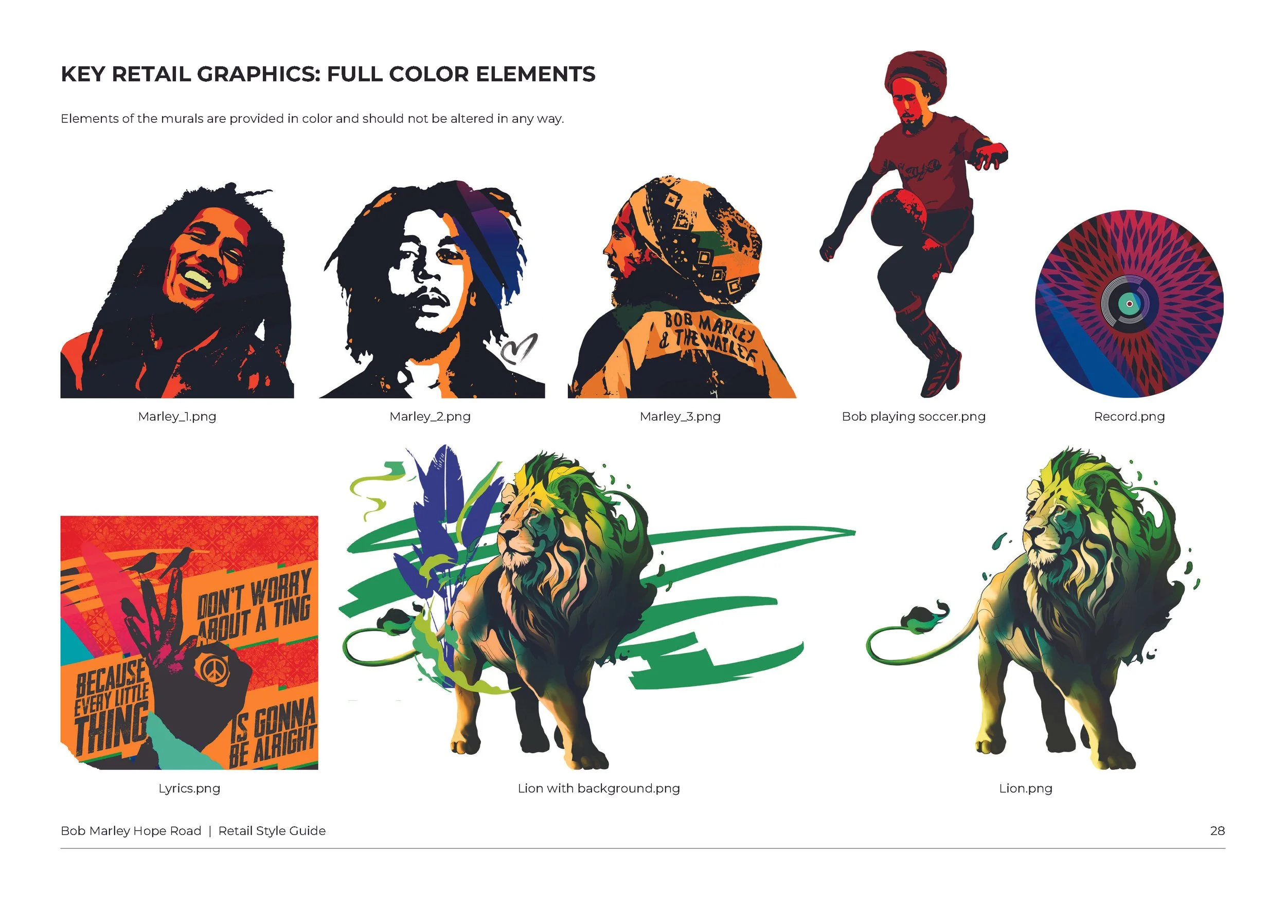 An immersive creative guide for the Bob Marley “Hope Road” experience, developed for the producers of the Bob Marley “Hope Road” experience in collaboration with FiveCurrents and Primary Wave. I designed a visual system blending the brand’s mural art, lyrical motifs, and cultural heritage into a cohesive toolkit for retail partners—uniting color, typography, and pattern for merchandise and in-store storytelling. I also created a series of playful wordmarks inspired by Bob Marley lyrics to spark retail design concepts and product ideas.